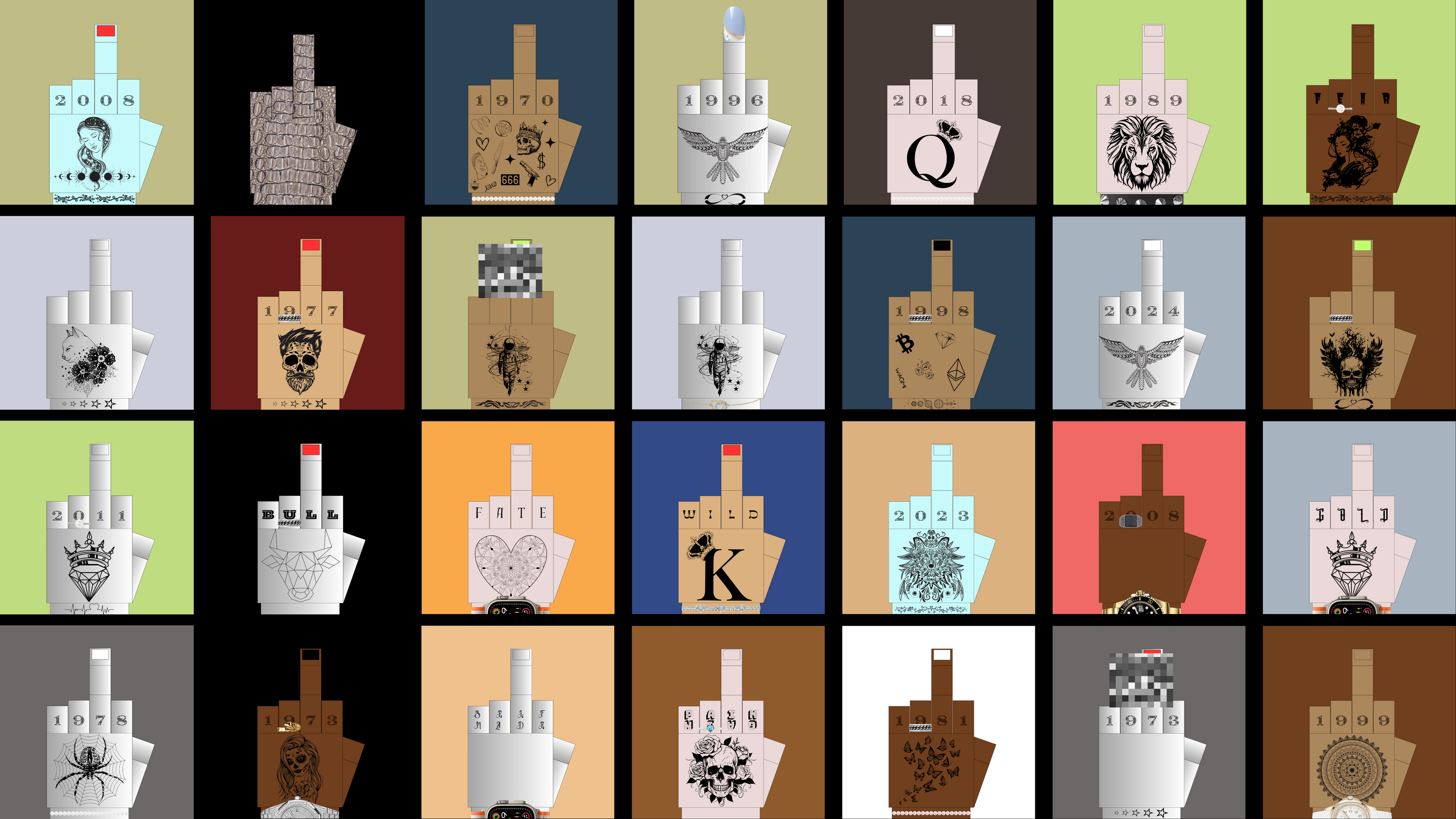 A wide combination of backgrounds, hands type, tattoos, jewellery, watches, and nails color plus five epic 1/1 animals fur. Find the perfect combo that represents your bold, rebellious spirit. Shout to the world: "F**K #wedontcare"